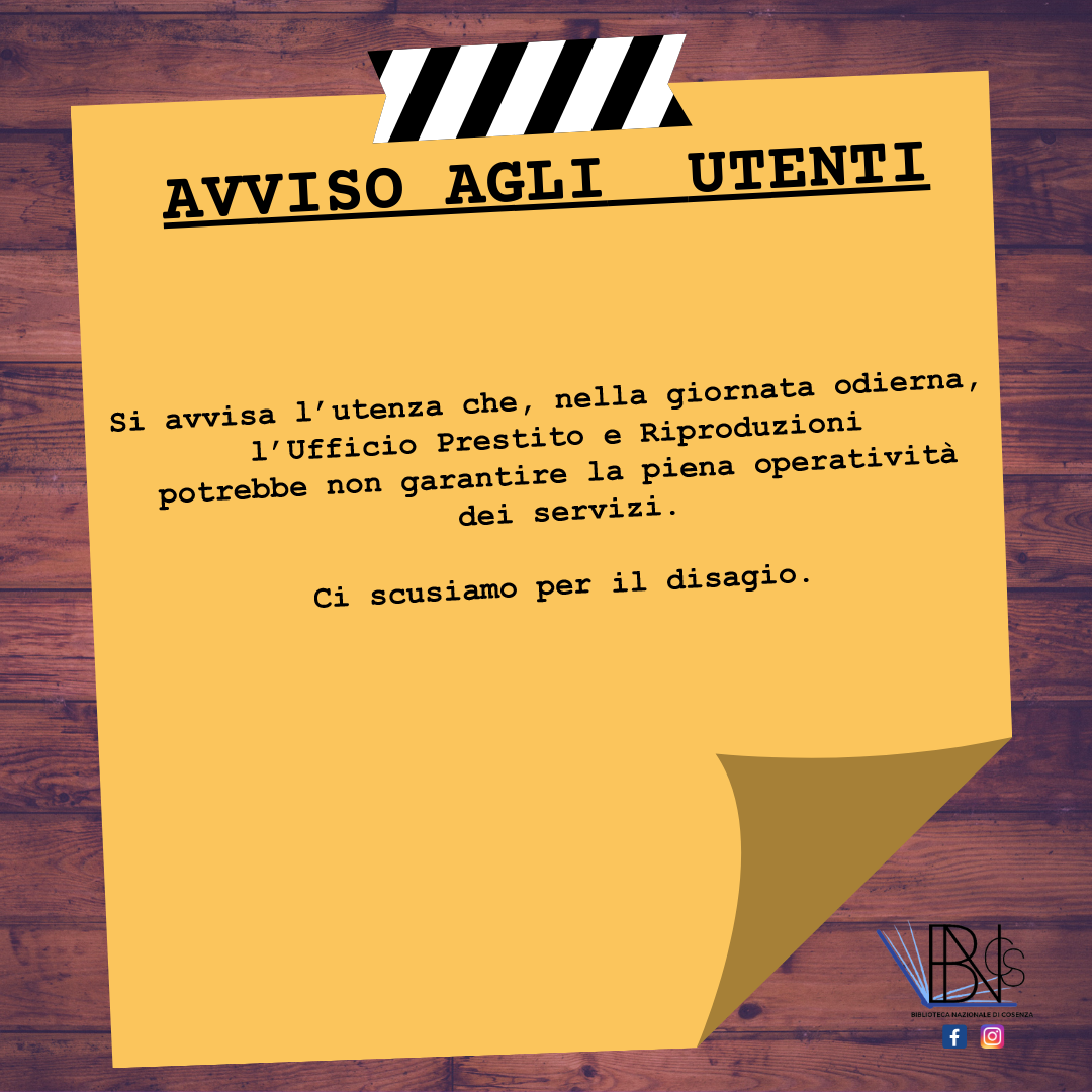Si avvisa l’utenza che, nella giornata odierna, l’Ufficio Prestito e Riproduzioni potrebbe non garantire la piena operatività dei servizi.