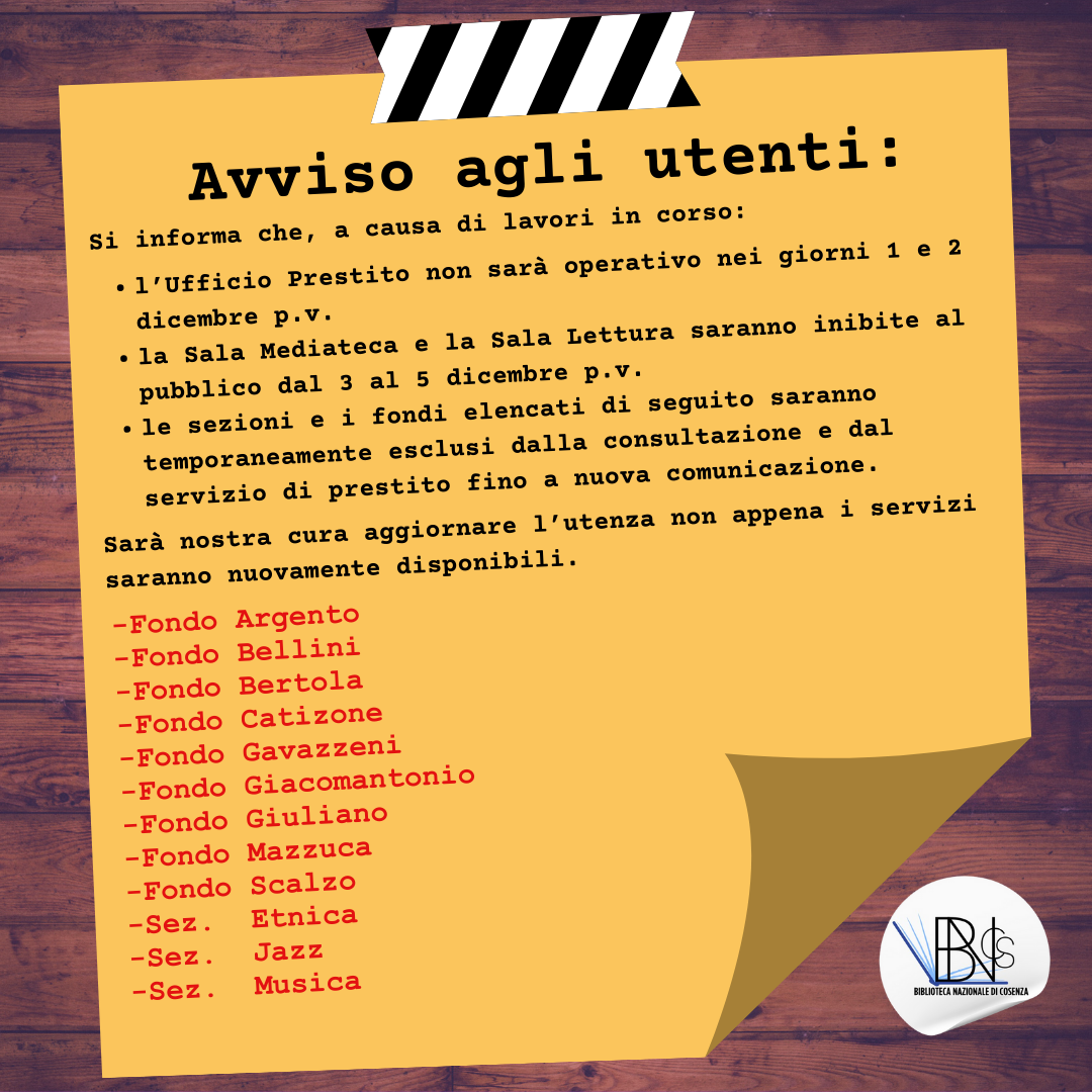 - la Sala Mediateca e la Sala Lettura saranno inibite al pubblico dal 3 al 5 dicembre p.v.